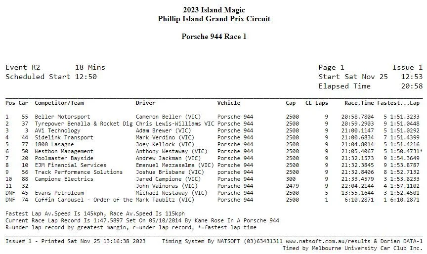 Beller Motorsport driver Cameron Beller has taken out a hard fought victory, during Race 1 of 3, in the 2023 Porsche 944 Challenge Series ‘Island Magic’ event at the Phillip Island Grand Prix Circuit.